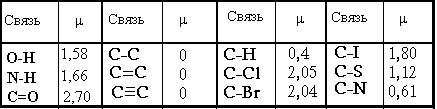 где М- относительная молекулярная масса вещества; r- плотность вещества, NA- постоянная Авогадро; k- постоянная Больцмана, равная R/ NA (R- универсальная газовая постоянная); a- деформационная поляризуемость молекул. Измерив e при двух температурах, с помощью уравнения Ланжевена-Дебая можно определить a и m. Есть и другие методы экспериментального определения m. Значения дипольных моментов для некоторых связей между разнородными атомами приведены в таблице: