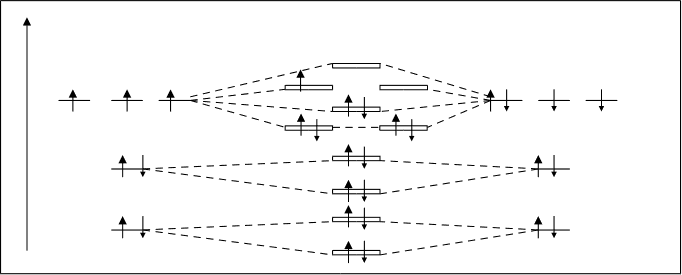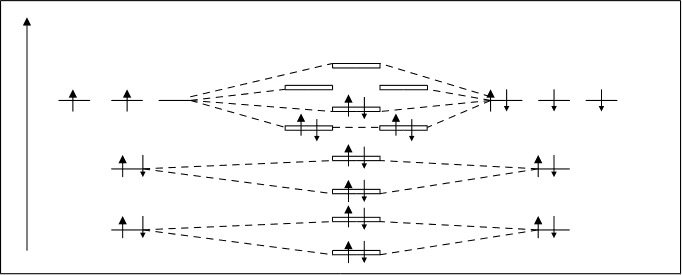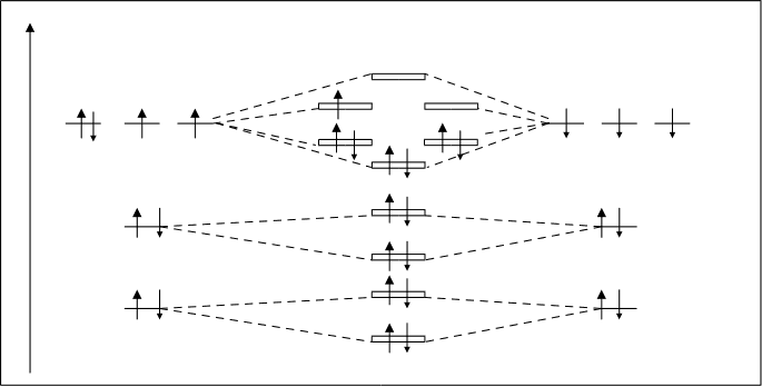 Y не каждого уровне может быть три р-орбитали. р-орбиталь X лагаются в пространстве по направлению координатных Px осей. Их называют соответственно рх, рy, рz-орбитали Py (рис.2.6.). Р X X X X Y dz2 dx2 y2 dxy dxz dyz рис.2.7. d-орбиталь. Появляется при l=2 на третьем квантовом уровне. На d-подуровне может быть уже пять различных состояний электронов, поэтому на d-подуровне каждого квантового уровня содержится пять d-орбиталей. В этом случае ml принимает пять значений: ml = –2, –1, 0, +1, +2, d-орбитали имеют более сложную форму, чем р-орбитали, они либо в виде четырех лепестков либо в виде гантели с ободком (рис.2.7.). f-орбиталь. Появляется при значении l=3. f-орбитали могут быть только на четвертом и более отдаленных уровнях. Так как при l=3 ml имеет 7 значений /–3, –2, –1, 0, +1, +2, +3/, то на f-подуровне может быть семь орбиталей. Форма f-орбиталей еще более сложная, чем у d-орбиталей. f-орбитали изображают в виде сложных шестилепестковых фигур. Форма орбиталей и ее направленность играют существенную роль при образовании химических связей, т.к. эти два фактора определяют характер и степень перекрывания электронных облаков соединяющихся атомов. 2.1.5. Структура электронных оболочек атомов. Полная электронно-энергитическая структура атомов предопределяется набором рассмотренных квантовых чисел. Главное квантовое число n определяет не только номер квантового уровня, но и указывает на число подуровней содержащихся в данном уровне. Например, при n=3, имеем третий квантовый уровень, который состоит из трех подуровней: s-, p-, d-подуровня. Чем дальше от ядра находится квантовый уровень, тем он более емкий, тем из большего числа подуровней он состоит. Число орбиталей на уровне можно определять по формуле кn=n2, а число орбиталей на подуровне, как уже указывалось, по формуле кl=2l+1. Рассмотрим теоретическую схему взаимного расположения квантовых уровней и подуровней. /Фрагмент для первых четырех уровней/. На четырех вертикальных линиях отложим значения квантовых чисел n, l, ml и ms.(рис.2.8.) На первой вертикальной линии изобразим квантовые уровни соответственно значениям квантового числа n /см. рис.2.8.). Мы уже знаем, что чем больше числовое значение n, тем более емкий квантовый уровень. По этому на рисунке он сделан более длинным по высоте. На второй вертикальной линии, отнесенной к квантовому числу l показано деление квантовых уровней на подуровни. Первый квантовый уровень состоит только из одного подуровня /обозначенного как s-подуровень/. Второй квантовый уровень делится уже на два подуровня: s-подуровень и р-подуровень. Третий уровень делится на три подуровня /s, p и d/, а четвертый – на четыре подуровня /s, p, d и f/.
