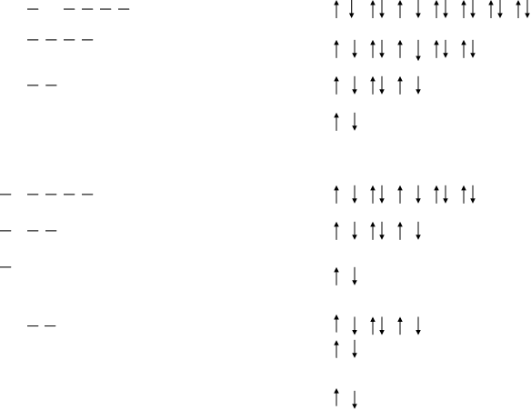 В зависимости от того, какой подуровень заполняется последними электронами, различают s-, p-, d-, f-элементы. s-элементами называют такие элементы, в атомах которых последние электроны занимают s-подуровень внешнего квантового уровня. /Например, натрий, магний, калий, кальций и др./. р-элементами называют такие элементы, в атомах которых последние электроны занимают р-подуровень внешнего квантового уровня. /Например, углерод, кислород, хлор и др./. d-подуровень, заполняемый последними электронами, относит элементы к d-элементам. /Например, d-элементами являются титан, хром, железо, медь, т.к. у этих элементов последние электроны занимают d-подуровень предпоследнего уровня/. f-элементами называют такие элементы, в атомах которых последние электроны занимают f-подуровень второго от вне квантового уровня. /Например, празеодим, европий, эрбий и др./. 2.1.7. Изображение электронной структуры атомов при помощи электронных формул и квантовых ячеек. Электронную структуру любого атома изображают электронными формулами. В электронных формулах квантовый электронный уровень обозначают численным значением главного квантового числа n, подуровень записывают буквенным обозначением соответствующего подуровня, а число электронов на подуровне указывают степенью, стоящей у обозначения подуровня. Например, 3d5 обозначает, что на d-подуровне 3-го квантового уровня находится пять электронов. Электронная формула любого элемента состоит из полного набора таких фрагментов, как указано в примере. Так, электронная формула атома титана /№22/ имеет вид: 1s22s22p63s23p64s23d2. Cумма всех степеней равна 22, это значит, что атом титана, имея заряд ядра +22, содержит на электронной оболочке 22 электрона, которые своим суммарным отрицательным зарядом (–22) компенсируют положительный заряд ядра атома, делая атом сложной электронейтральной системой. Электронные формулы удобнее составлять после рассмотрения структуры периодической системы элементов Д.И.Менделеева. Забегая вперед и основываясь на знаниях, полученных в средней школе, представим периодическую систему элементов в виде электронных формул. (рис.2.10.) О написании электронных формул конкретного элемента, находящегося в периодической системе, вернемся позже и рассмотрим алгоритм по которому легко научиться писать электронную формулу любого элемента. Во-вторых, структуру электронной оболочки атома изображают при помощи квантовых ячеек. I |