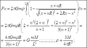 Задание : доказать, что два шара однородной плотности притягиваются друг к другу как две матариальные точки, расположенные в центрах этих шаров. Говорят, что Ньютону удалось это доказать. Закон гравитации для материальных точек : FT = G m1m2 / R2.