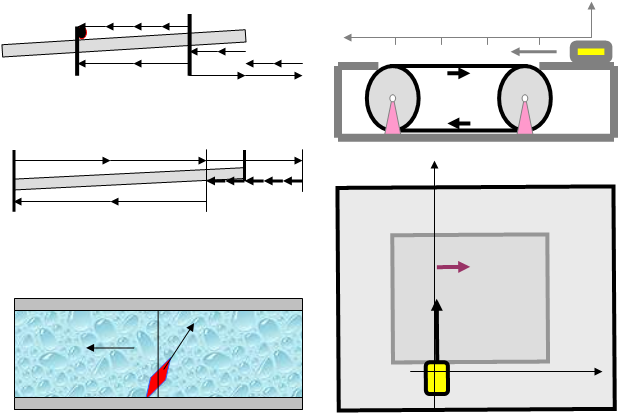 ВЕКТОРНЫЕ И КООРДИНАТНЫЕ ПОСТРОЕНИЯ. Задача1: Рыбак грёб на лодке против течения /Рис.1/. Под первым мостом он обронил поплавок. Через 20 минут он обнаружил пропажу и повернул лодку назад, чтобы догнать поплавок. Под вторым мостом он догнал этот поплавок. Каково расстояние между мостами, если скорость течения реки равна 6 км/ч? Задача 2: От порта А до порта В /Рис.2/ катер против течения прошёл за 3 часа, обратный путь он преодолел за 2 часа. Скорость катера постоянна. Сколько времени будет плыть от порта В до порта А плот? Задача 3: Под каким углом к линии, перпендикулярной скорости течения реки, должна плыть лодка /Рис.3/, чтобы двигаться по этой линии? Какова будет скорость лодки относительно берега? Скорость лодки относительно воды - 5 м/с, течения – 3 м/с. Задача 4: На рисунке 4 изображен транспортёр. Описать движение тела, имеющего скорость 10 м/с в начале пути, до полной его остановки. Скорость ленты – 5 м/с. Коэффициент трения k = 0,4. Задача 5: . На рисунке 5 – вид сверху на транспортёр. Построить систему координат и описать движение в ней тела, имеющего скорость 10 м/с, до полной остановки этого тела. Скорость ленты – 5 м/с, ширина её – 10 м, k = 0,4