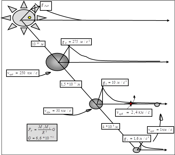 На схеме изображена гигантская инерциальная система – наша галактика «Млечный путь», где все космические тела обращаются вокруг своих центральных тел. Расстояния между телами и размеры тел можно измерить методом геометрической триангуляции. Движения тел подчиняются закону тяготения и закону инерции. Задания :
