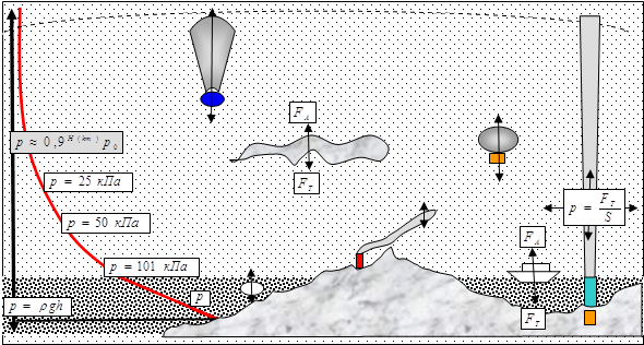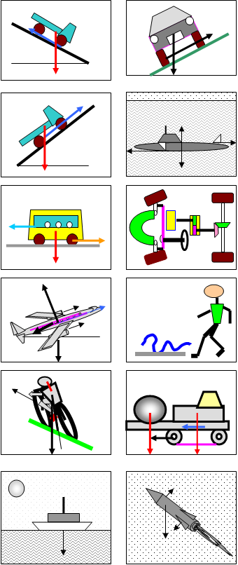 Автомобиль движется с горы Автомобиль на косогоре Автомобиль движется в гору Подводная лодка в движении Перегрузка при торможении Передача движений в автомобиле Самолёт в наборе высоты Движение человека и змеи/бионика/ Балансировка велосипедиста Погрузчик на гусеничном ходу Маневры корабля на воде Маневры космической ракеты Пример описания : Объект : самолёт в наборе высоты Атмосфера не может служить жёсткой опорой для самолёта, но воздух обладает инерцией. Двигатели, отталкивая от себя воздух, создают реактивную тягу, крыло, отклоняя встречный поток воздуха на некоторый угол по отношению к траектории полёта, создаёт подъёмную силу. Инертный воздух оказывает сопротивление движению самолёта. Схема сил и моментов: