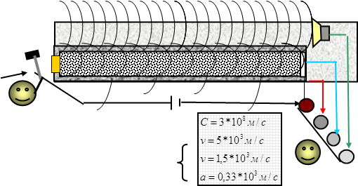 L=0,2 2) Какую максимальную скорость приобретёт правое тело? 3) Какую скорость относительно стенки приобретёт вся упругая система, то есть её центр масс? 4) В какой момент придёт в движение левое тело? 5) С какой амплитудой относительно центра масс системы будут колебаться тела? 6) Начертить график скоростей тел в зависимости от расстояния до стенки, используя характерные точки на траектории их движения. m v m m