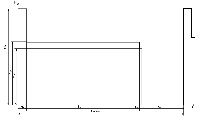 Нагрузочной диаграммой называется зависимость силы тока, момента, мощности в функции времени. Для выбранного двигателя по полученным данным строим нагрузочную диаграмму М =(t) учитывая реальные времена протекания переходных процессов и величины пусковых и тормозных моментов, а также реальные значения пауз между временами работы двигателя. г tp- время работы; tm- время торможения; t0- время паузы. Mn- момент пуска; Mp- момент работы; Mm- момент торможения.
