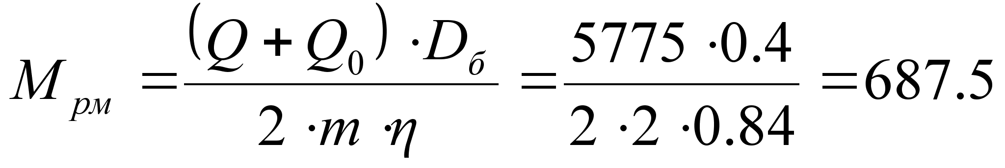 где Q+Q0 – вес груза с крюком (кг) (Q+Q0 = 5775 кг) Dб – диаметр барабана (Dб = 0.4 м) m – число полиспастов (m = 2) - кпд электропривода ( = 0.84)