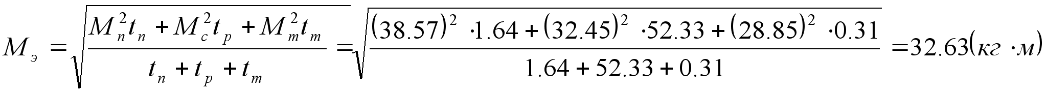 где ПВд – действительная продолжительность включения двигателя ПВк – ближайшая по величине стандартная продолжительность включения по отношению к действительной ПВ. Если полученная в результате расчёта мощность Рк < Рн двигатель, который был предварительно выбран, по условиям нагрева проходит. Если же Рк > Рн, то необходимо задаваться следующим габаритом двигателя и расчёт производить вновь. Определяем эквивалентный момент: