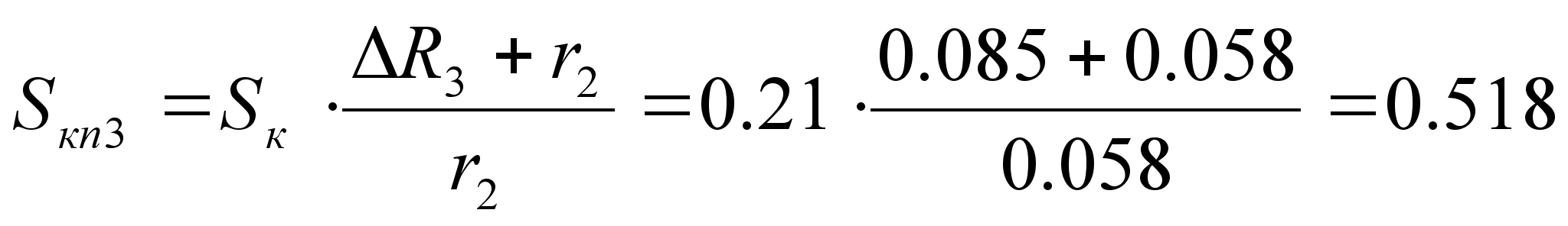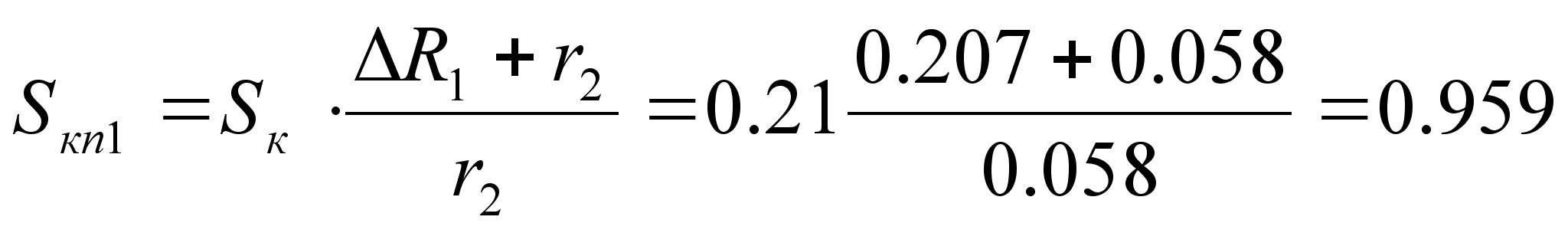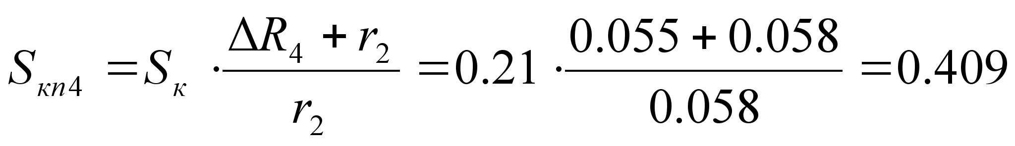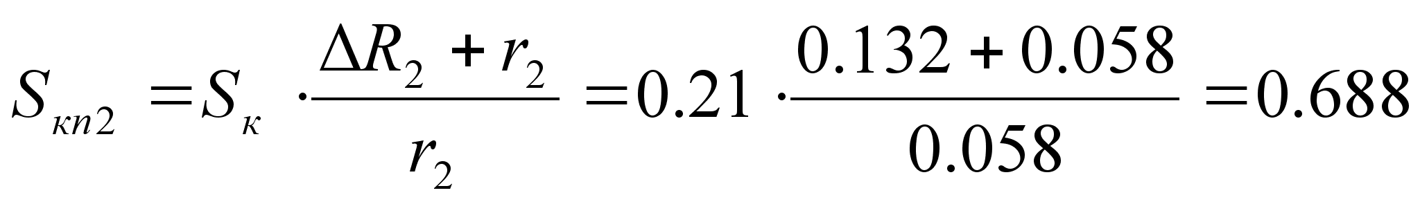 Сопротивление одной фазы ротора при работе двигателя на второй ступени (R2) определяется из уравнения: R2 = R1. R2 = 0.575 . 0.64 = 0.368 (Ом) Сопротивление одной фазы ротора при работе двигателя на третьей ступени (R3); R3 = R2 . = R1. 2 R3 = 0.368 . 0.64 = 0.575 . 0.642 = 0.236 (Ом). Сопротивление одной фазы ротора при работе двигателя на четвёртой ступени (R4); R4 = R3 . = R1 . 3 R4 = 0.236 . 0.64 = 0.575 . 0.643 = 0.151 (Ом). Сопротивление одной фазы ротора при работе двигателя на пятой ступени (R5); R5 = R4 . = R1 . 4 R5 = 0.151 . 0.64 = 0.575 . 0.644 = 0.096 (Ом). Сопротивление ступени реостата, закорачиваемого при переходе со ступени на ступень определяется как разность сопротивлений на двух смежных ступенях: R1 = R1 – R2, R1 = 0.575 – 0.368 = 0.207 (Oм); R2 = R2 – R3, R2 = 0.368 – 0.236 = 0.132 (Ом); R3 = R3 – R4, R3 = 0.236 – 0.151 = 0.085 (Ом); R4 = R4 – R5, R4 = 0.151 – 0.096 = 0.055 (Ом). Критическое скольжение при введённом резисторе в цепь ротора будет: а) При R1 = 0.207 (Ом) б) При R2 = 0.132 (Ом)