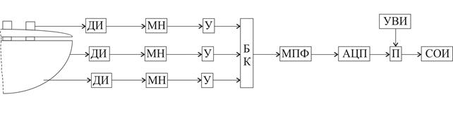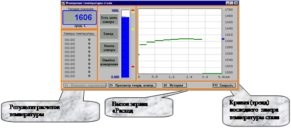 где: ДИ – датчик информации; МН – модуль нормализации; У – усилитель; БК – блок коммутации; МПФ – модуль противоподменной фильтрации; АЦП – аналогово-цифровой преобразователь; П – процессор (контроллер); УВИ – устройства ввода информации; СОИ – средства отображения информации. Контролируемый параметр в виде сигнала измерительной информации поступает с выхда ДИ на вход блока коммутации через модуль нормализации и усилитель, при этом сигнал приводится к стандартному (в случае необходимости производится преобразование токового сигнала в сигнал напряжения или наоборот, усиление уровня сигнала до требуемого уровня). Модуль противоподменной фильтрации является обязательным элементом при наличии в цепи аналогово-цифрового преобразователя, так как использование АЦП всегда сопровождается эффектом подмены частот (три этом наиболее опасными являются частоты, равные, или кратные, половине частоты дискретизации). Устройства ввода информации служат для ввода диапазона измерения контролируемых параметров, величин аварийной и предупредительной сигнализации и тд. Система отображения информации реализована на двух компьютерах промышленного исполнения фирмы Allen-Bradley. Созданная на базе программного обеспечения RSView32 программа управления печью имеет дружественный графический интерфейс и позволяет осуществлять контроль и регулирование большинства параметров. Измерение температуры стали