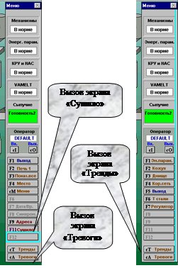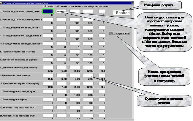 Принудительный вызов (вызов с отменой управления, производимого с другой рабочей станции) выполнять в соответствии с рекомендациями, написанными на дисплеях. Экран ввода уставок технологической и аварийной сигнализации Вызов производится нажатием клавиш «Уставки» в экранах «Энергетические параметры».