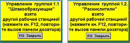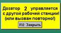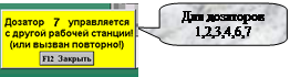 Предотвращение возможности одновременного управления одним объектом с двух и более рабочих станций. Если работой дозатора управляют с одной рабочей станции, то при попытке вызова панели управления этим дозатором с другой рабочей станции, на первой активизируется дисплей о том, что дозатор управляется с другой.