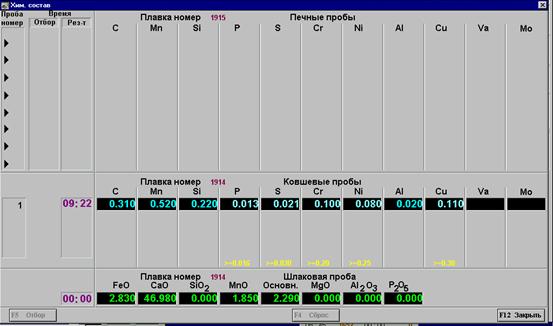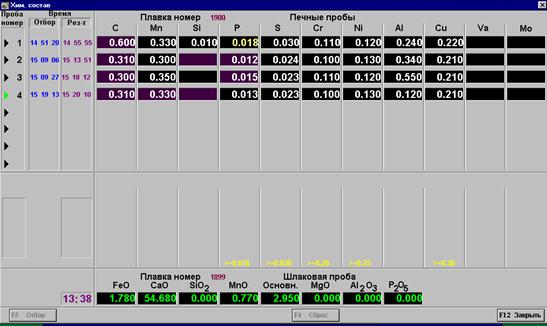 При приходе ковшевой пробы значения печных проб обнуляются.