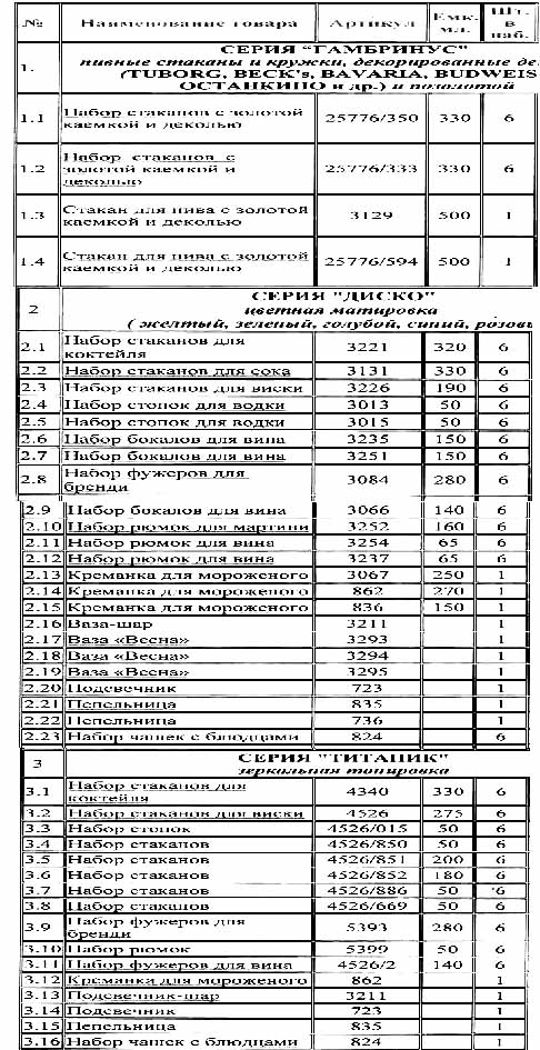 ЗаключениеРазвитие стекольного производства – один из составляющих факторов развития экономики нашей страны. Для изготовления бытовой посуды и декоративных изделий используют оксидные стекла, в которых основными стеклообразователями являются оксиды кремния, бора, алюминия и др. Производство стеклянных изделий состоит из обработки сырья, составления шихты, варки стекломассы, формования и отжига изделий, первичной и декоративной их обработки. Потребительские свойства и основные признаки ассортимента стеклянных изделий формируются на стадии проектирования и конструирования при создании опытных образцов и в процессе серийного изготовления. Ассортимент стеклянных товаров достаточно динамичен и изменяется в связи с постоянным развитием науки, состоянием технологии производства, характером потребительского спроса, сменой стилевых направлений. Ассортимент изделий бытового назначения классифицируют по назначению и условиям эксплуатации, составу и окраске стекла, методу формования и характеру термической обработки, видам (наименованиям), размерам, фасонам изделий, методам и сложности декорирования, комплектности. Потребительские свойства стеклянных изделий обусловливают возможность их использования по назначению, удобство и надежность в эксплуатации, красоту и художественную выразительность. Они зависят от совершенства авторского образца, свойств стекла и качества изготовления изделий. Показателями ряда потребительских свойств изделий являются показатели физико-химических свойств стекла. Издели изготавливают в соответствии с ГОСТами: ГОСТ 4.75—82 «Посуда сортовая из стекла. Номенклатура показателей», по качеству изготовления посуда из натрийкальцийсиликатного стекла должна соответствовать требованиям ГОСТ 26821—86. Стандарты ограничивают возможные дефекты изделий. Контроль качества посуды из стекла осуществляют по ТОСТ 26821 — 86, ГОСТ 1770—74, ГОСТ 23676—79. Маркировка и упаковка должна соответствовать требованиям стандартов по ГОСТ 8273 —-75. ООО «1000 мелочей» на основе договорной системы работает с многими поставщиками стеклянной посуды: ЗАО «Термопульс» г. Брянск, ОАО «Первомайский стекольный завод» п. Первомайский Смоленской области Шумячского района, ООО Производственное предприятие ИНТЕР-АРТ ХХI г. Тверь, ООО фирма «ДП-Трэйд» г. Москва, АО «Стекольные заводы KAVALIER», ООО «Уралпосуда» Гусь-Хрустальный. В результате хорошо отлаженной системы поставок, в магазин «1000 мелочей» поступает большой ассортимент посуды из стекла, различные серии стаканов, бокалов, креманок ведущих мировых производителей. Анализ динамики реализации стеклянной посуды в магазине ООО «1000 мелочей» за период 1998-2000 г. показал, что товарооборот увеличился в 2000 году по сравнению с 1998 годом. Реализация товаров в 1998 году была крайне низкая, так как в целом ситуация в экономике страны была в тяжелом и не стабильном состоянии, что сказывалось на уровне жизни населения и покупательской способности. С улучшением положения в экономической сфере, появились тенденции к росту товарооборота и получению прибыли. Анализ данных по структуре ассортимента стеклянной бытовой посуды, реализованной магазином ООО «Тысяча мелочей» в 2000 г. показала, что наибольший удельный вес по количеству и по сумме реализованных товаров составила группа столовой посуды, т