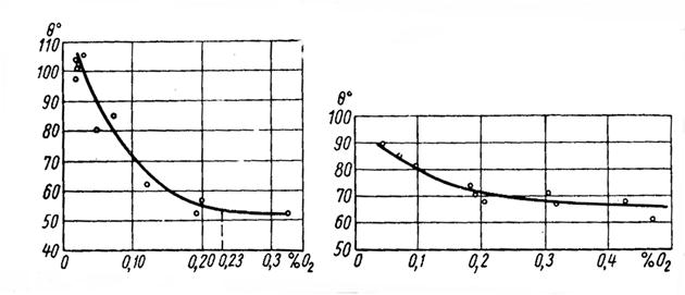 Рис.1. Влияние окисленности жидкого металла на краевой угол смачивания: а—кварцевого песка; б—хромистого железняка. . . Установлено, что при отрицательном смачивании (cosθ<0) независимо от газовой среды увеличение размера зерен приводит к значительному увеличению смачивания. При положительном смачивании (cosθ>0) изменение размера зерен не влечет за собой изменения краевого угла смачивания, повышение температуры металла в пределах до 100° С над ликвидусом не изменяет величины краевого угла смачивания. Из формулы видно, что величина Pкр в значительной мере зависит от Ркап, т. е. от противодавления газов в порах смеси. Дополнительные исследования, проведенные Я. И. Медведевым [6]; ЦНИИТмаше, позволили определить величину избыточного давления газа Ад в стенках формы: