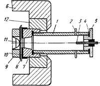 Описанный метод требует создания довольно громоздкой установки. Кроме того, в ряде случаев этот метод не позволит уловить различие в трудоемкости удаления пригара разного вида. Например, при одинаковой толщине пригарной корки метод Н. Т. Жарова дает одинаковые значения работы для пригара 5, 6 и 7-го баллов (см. табл.4), и, наоборот, для пригара, отделяющегося пластами (5-й балл), величина работы будет зависеть от толщины пригарной корки, хотя прочность сцепления пригара с отливкой остается одной и той же. В качестве одного из таких методов можно предложить метод определения прочности сцепления эмалевого покрытия с металлом, описанный в работе [7]. Измерения могут быть осуществлены при помощи простой приставки к прибору типа ПТЛ (рис.13) для испытания листового металла выдавливанием. Стальной цилиндр 1 с крышкой 5, между которыми находится резиновая прокладка 4, соединяется с втулкой 7, вставляющейся в обойму 12 прибора ПТЛ 6 со стороны выдавливающего пуансона 11 вместо съемной матрицы. Образе 8 металла с химическим пригаром зажимают между винтом 9 прибора, он изолируется тонкой резиновой прокладкой 10 и резиновой манжетой втулки 7.