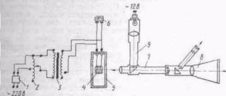 где р — удельное сопротивление электролита, равное для 10%-ного раствора NaCI 8,26 ом-см; q — толщина слоя пригара в см; J — сила тока в а; U — напряжение на клеммах питающего прибора трансформатора в В; R — сопротивление внешней цепи в ом. Конечно, это не единственный метод измерения прочности сцепления пригара с металлом, который может быть заимствован из других отраслей. Можно определять прочность сцепления по величине разрушения пригарной корки при ударе металлического шарика соответствующего веса, падающего с некоторой высоты. Исходя из того, что между слоем пригара и металлом всегда находится слой чистых окислов самого металла и что вероятнее всего отрыв пригара происходит по этому слою окислов, одним из авторов совместно с А. М. Ляссом и А. А. Багровым была предложена методика прямого определения прочности сцепления окисных пленок с металлом. Образцы специальной формы окислялись при заданных температуре и атмосфере в течение необходимого времени и охлаждались. Контрольной торцовой поверхностью образцы приклеивали клеем высокой прочности к захватам разрывной машины. После затвердевания клея производили обычное испытание на разрыв и определяли прочность отрыва пленки (в кгс/см2). Многочисленные эксперименты подтвердили высокую точность, чувствительность и воспроизводимость результатов. В частности, этот метод позволил установить резкое повышение прочности сцепления окисной пленки при увеличении содержания углерода в железо углеродистых сплавах более 2%, т. е. подтвердил ранее обнаруженную зависимость адгезии расплава силиката натрия от содержания углерода. В дальнейшем указанный метод был усовершенствован, и испытаниям стали подвергать образцы, на которых предварительно получали слой пригара, прочно сцепленного с металлом . Таким образом, довольно простая методика позволяет быстро проводить прямое определение прочности сцепления пригарного вещества с отливкой. 3.6 Прибор Челябинского Политехнического Института Прибор, созданный в лабораторий технологии литейных процессов Челябинского политехнического института, измеряет удельную работу разрушения Ауд корки пригара ударным воздействием бойка долотчатой формы. Принцип действия прибора основан на том ,что груз 5 скользит по штоку 6, затем достигает упора ,жестко связанного со штоком и бойком 2, боек 2 передает энергию падающего груза на образец 10 ,тем самым отбивая частицу пригара от исследуемого образца . Зная вес падающего груза и высоту его падения, легко найти работу по удалению корки пригара с поверхности отливки. Список использованной литературы 1. Берг. П. П. Формовочные материалы. - М.: Машгиз ,1963.- 408с. 2. Валисовский И.В. Пригар на отливках. - М.: Машиностроение,1983.-192с. 3. Васин Ю.П.,Иткис З.Ю. Окислительные смеси в конвейерном производстве стального литья. - Челябинск: Южно-Уральское кн. изд., 1973. - 153с. 4. Н.Т. Жаров .Приспособление для оценки степени пригара на образцах.-Сб. «Вопросы теории и практики литейного производства». Свердловск. Машгиз,1956.-231с. 5. Лясс А.М. Быстротвердеющие формовочные смеси. - М.: Машиностроение, 1965. – 332с. 6. Оболенцев Ф. Д. Точность и качество поверхностей отливок.-М.:Машиностроение,1962.-209с. 7. Получение отливок без пригара в песчаных формах/ С.П. Дорошенко, В.Н. Дробязко, К.И. Ващенко и др. - М.: Машиностроение, 1978.- 206с. 8. Сварика А.А. Покрытия литейных ф