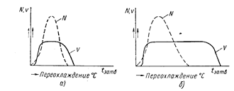ков можно достигнуть, увеличивая скорость их охлаждения или изменяя их состав. Рис.2. Количество центров кристаллизации N и линейная скорость роста кристаллов о в зависимости от степени переохлаждения сплава с малым (а) и большим (б) интервалами кристаллизации. Жидкие силикатные массы требуют сравнительно незначительного переохлаждения ниже температуры солидуса для того, чтобы возникновение и рост кристаллов в этих жидкостях прекратились и чтобы вся жидкость при последующем охлаждении затвердела в стеклообразном состоянии. Наиболее легко стеклообразные массы образуют силикатные сплавы с малым интервалом кристаллизации. Это объясняется тем, что в системах с большим интервалом кристаллизации первоначально выделяющееся твердое вещество имеет возможность свободно развиваться в виде кристалла, получая необходимый для роста материал из оставшейся еще подвижной и не слишком вязкой жидкости. Наоборот, силикатные массы эвтектического состава или силикаты с малым интервалом кристаллизации становятся вязкими за более короткий отрезок времени, и поэтому рост кристаллов в этих системах бывает затруднен. Конкретные значения критических скоростей охлаждения сложных силикатов очень мало изучены. Принципиальная сторона вопроса иллюстрируется предложенными И. Б. Куманиным схемами (рис.2). Он указывает, что для жидкости с малым интервалом кристаллизации уменьшение скорости роста кристаллов (сплошные линии) наступает при меньшей степени переохлаждения или, что то же самое, при более медленном ее остывании. Пунктирные линии, соответствующие числу возникающих в жидкости центров кристаллизации, имеют аналогичный характер. Из сопоставления схем составов с малым и большим интервалами кристаллизации вытекает, что при поздней выбивке отливок и при охлаждении их вместе с формой важно иметь пригарную корку, сцементированную жидкостью отличающейся малым интервалом кристаллизации. Такая жидкость, даже при сравнительно медленном остывании отливки (а, следовательно, и при медленном остывании пригара), образует стекловидную пригарную массу, легко отделимую от металла. Интервал кристаллизации пригарной массы, образующейся на поверхности соприкосновения металла и формы, уменьшается по мере сокращения содержания кремнезема в этой массе и по мере насыщения ее основными окислами. Одновременно падает температура затвердевания пригарной жидкости, и, следовательно, количество этой жидкости и толщина пригарного слоя возрастают. Таким образом, получение чистых отливок с легкоотделяющимся стекловидным пригаром сопровождается не уменьшением, а увеличением массивности пригарных корок, при этом особенностью корок является их высокая хрупкость и отсутствие прочной связи с отливкой. В наибольшей степени интервал кристаллизации пригарной жидкости (и понижение температуры ее затвердевания) сокращается при добавлении в смеси краски или окислов щелочных и щелочноземельных металлов. Известно, что при использовании смесей с жидким стеклом получаются чистые стальные отливки, покрытые сверху слоем легкоотделимого пригара. Для затвердевания пригарной жидкости в стеклообразном состоянии требуется некоторое ее переохлаждение ниже температуры солидуса. Иными словами, пригарная жидкость любого состава получит аморфное строение только в 