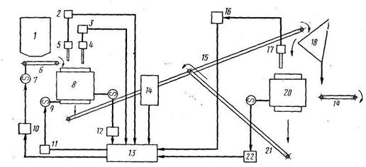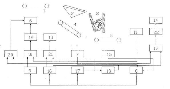 Рис. 1.1. Автоматизация двухстадийного дробления по замкнутой схеме Из бункера 1 питатель 6 загружает дробилку первой стадии 8, откуда через конвейер 15 и грохот 18 продукт дробления поступает в дробилку 20 второй стадии. Подрешетный продукт поступает на конвейер 19. Из дробилки 20 продукт дробления пропускается через грохот 18. В схеме используются датчики мощности 12 и 22, сигнализаторы уровня 16 и 17 заполнения дробилки 20, конвейерные весы 14, датчики уровня 4 и 5 в воронках 2 и 3, электропривод 7 и вариатор 10, исполнительный механизм 9 изменения щели дробилки первой стадии с преобразователем 11 и логическое устройство 13, управляющее схемой. Конвейер 21 является
