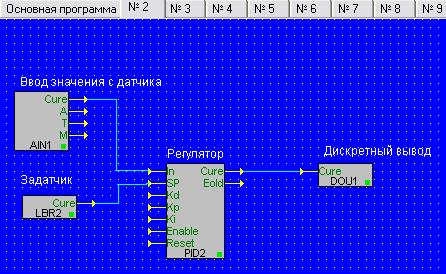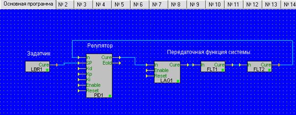 Устройство управления системой реализуем на базе контроллера ROBO 3140 с помощью системы графического программирования контроллеров Good Help, которая представляет собой поддержку языка функциональных блоковых диаграмм – FBD (Function Block Diagrams). Графический язык диаграмм функциональных блоков (далее FBD) позволяет технологу строить сложные схемы на основе существующих функций библиотеки системы Good Help, связанных в диаграмму. Диаграмма FBD описывает функцию, определяющую взаимодействие между входами и выходами блоков, имеющихся в библиотеке. Элементарный блок выполняет одну функцию взаимодействия между своими входами и выходами. Схема разрабатывается путем размещения функциональных блоков на различных вкладках поля редактирования, которые позволяют создавать логическое разбиение контуров редактирования по группам. Для реализации полученного оптимального закона регулирования необходимо в редакторе схем (edchart) с помощью стандартных блоков набрать соответствующую программу.