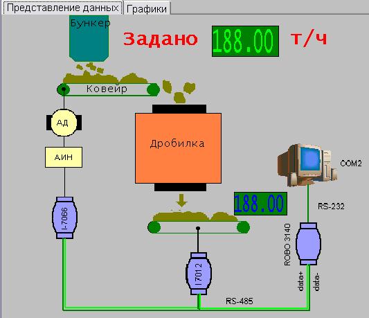 Для проверки системы отображения информации на пульте оператора можно создать тестовую схему, описывающую математическую модель объекта управления. Программа регулирования производительности щековой дробилки в тестовом режиме.