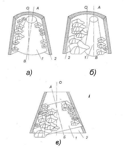 Рис. 2.2. Расположение конусов дробилки В конусных дробилках с крутым конусом и подвешенным валом (рис. 2.2, а) внутренний конус совершает круговые колебания около неподвижной точки О, находящейся на оси наружного конуса, при этом центр основания внутреннего конуса описывает окружность вокруг этой оси. В конусных дробилках с крутым конусом (рис. 2.2,6) круговые колебания внутреннего конуса 1 совершаются с перемещением его оси по образующей А — В цилиндра с радиусом, равным эксцентриситету Г. В дробилках с консольным валом (рис. 2.2, в) точка О, вокруг которой совершаются круговые колебания внутреннего конуса 1, смещена вниз до уровня верхней кромки наружного конуса 2. При круговых колебаниях поверхность внутреннего конуса поочередно то приближается, то удаляется от нее. В момент приближения внутреннего конуса к поверхности внешнего происходит дробление, а при удалении раздробленный материал под действием