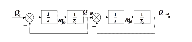 Щековая дробилка является объектом, работу которого характеризует производительность питателя Qп, ширина разгрузочной щели l, крупность D и прочность σ исходного материала, а также производительность Qдр, мощность N, потребляемая в процессе дробления, и гранулометрический состав дробленого продукта, характеризуемый средневзвешенным диаметром кусков dср. Возможные отклонения ширины разгрузочной щели от заданного значения, как правило, своевременно устраняются обслуживающим персоналом при профилактических осмотрах. Кроме того, изменение ширины разгрузочной щели в процессе эксплуатации настолько мало, что его влиянием можно пренебречь. С учетом сделанных ограничений: структурная схема щековой дробилки как объекта автоматического регулирования производительности приведена на рис.4.1. в котором в качестве входного регулирующего воздействия рассматривается производительность питателя Qп, в качестве выходной регулируемой величины -производительность дробилки Qдр.