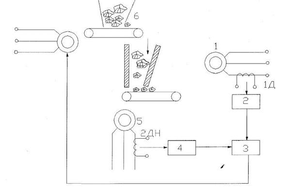 С целью повышения точности регулирования была разработана система с коррекцией по текущему значению производительности (рис. 2.3), измеряемой косвенным образом по мощности, потребляемой приводным двигателем отводящего конвейера. Поддержание заданной производительности дробилки достигается путем настройки датчиков 1Дн и 2Дн. Если нагрузка приводных двигателей 5 и 1 отводящего конвейера и дробилки меньше заданной, то с помощью выходных реле датчиков 2 и 4 через электронный блок 3 подается команда на включение пластинчатого питателя 6. В процессе дробления питатель отключается в том случае, когда нагрузка хотя бы на одном из двигателей превышает значение, на которое настроены датчики.