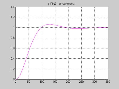 Рис. 5.3. Переходный процесс системы с ПИД – регулятором. Из переходных процессов видно, что наиболее оптимальным является ПИД – регулятор, т. к. у него меньше перерегулирование и меньше время переходного процесса.