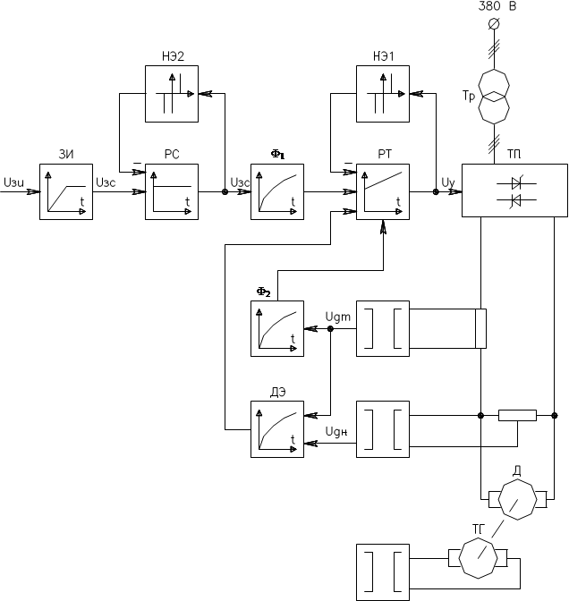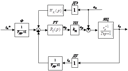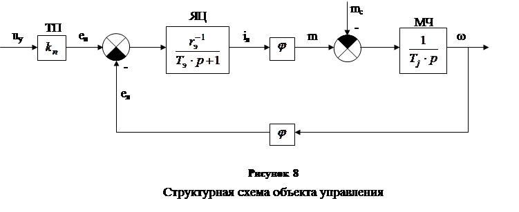 5.3 структурная схема объекта управленияНа структурной схеме объекта управления (рис. 8) представлены следующие звенья: ТП - тиристорный преобразователь (безынерционное звено); ЯЦ - якорная цепь двигателя (апериодическое звено с постоянной времени Тэ); МЧ - механическая часть привода (интегрирующее звено с постоянной времени Тj).