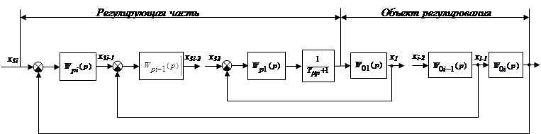 1. объект управления представляется в виде цепочки последовательно соединенных звеньев с передаточными функциями W01(p), W02(p), …, W0i-1(p), W0i(p), выходными параметрами которых являются контролируемые координаты объекта: напряжение, ток, скорость и т.д. 2. Количество регуляторов с передаточными функциями Wр1(p), Wр2(p), …, Wрi(р) в СПР устанавливается равным количеству регулируемых величин. Все регуляторы соединяются последовательно, так что выход одного является входом другого. Кроме того на вход каждого регулятора подается отрицательная обратная связь по той переменной, которая регулируется данным регулятором. В результате этого в системе образуются как бы вложенные друг в друга контуры регулирования. Таким образом, число контуров регулирования равно количеству регулируемых координат объекта. 3. Каждый внутренний контур управления подчинен следующему по порядку внешнему контуру, т.е. выходной сигнал регулятора любого внешнего контура является задающим для последующего, заключенного в него, контура. В итоге все внутренние контуры работают как подчиненные задаче регулирования выходной координаты системы. 4. Ограничение любой координаты достигается ограничением ее задания, т.е. выходного сигнала регулятора, внешнего по отношению к рассматриваемому контуру. 5. На выходе регулирующей части системы управления устанавливается фильтр. Постоянная времени Тμ этого фильтра является основным параметром системы авторегулирования и определяет важнейшие свойства системы. 6. Синтез регуляторов СПР осуществляется методом последовательной коррекции (начиная с внутреннего контура и кончая внешним). Практически при выборе передаточной функции регулятора Wpi(p) i-го контура стремятся решить две основные задачи: - обеспечить за счет действия регулятора компенсацию наиболее существенных инерционностей объекта, входящих в данных контур, и тем самым улучшить быстродействие системы; - обеспечить определенный порядок астатизма данного контура за счет введения в регулятор интегрирующего звена. Передаточная функция регулятора i-го контура будет иметь вид: