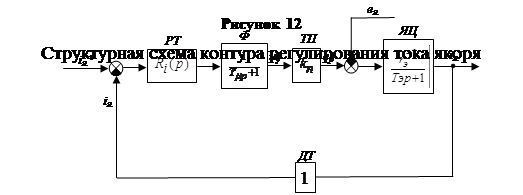 Контур регулирования тока якоря является внутренним контуром САУ электроприводом. Он образуется регулятором тока, фильтром с постоянной времени Тμ, тиристорным преобразователем, якорной цепью и обратной связью по току через датчик тока (kдт = 1). В объекте управления имеет место внутренняя обратная связь по ЭДС якоря двигателя. Структурная схема контура тока представлена на рис. 12. 7.2.2 Передаточная функция регулятора токаПри синтезе регулятора внутренняя обратная связь оп ЭДС не учитывается. Передаточная функция регулятора тока, найденная по условию настройки на модульный оптимум: