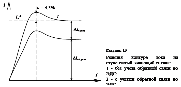 рис. 13. 7.2.3 Компенсация влияния ЭДС якоря двигателяДействие ЭДС якоря приводит к погрешности регулирования тока. Появляется астатизм контура по задающему воздействию. При единичном задании на ток статическая ошибка составит: