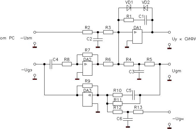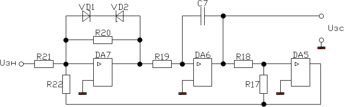 Нелинейный элемент реализуется на операционном усилителе DA7 за счет включения в обратную связь пары стабилитронов VD6 и МВ7. Интегратор реализуется на операционном усилителе DA6. Усилитель DA5 предназначен для инвертирования сигнала.