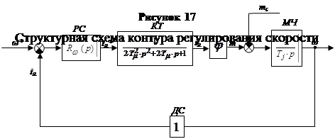 8 РАСЧЕТ КОНТУРА РЕГУЛИРОВАНИЯ СКОРОСТИ 8.1 рАСЧЕТНАЯ СТРУКТУРНАЯ СХЕМА КОНТУРА РЕГУЛИРОВАНИЯ СКОРОСТИСогласно требованиям, предъявляемым к электроприводу, система регулирования скорости выполняется однократной (см. п. 6). Структурная схема контура скорости представлена на рис. 17. Контур регулирования тока настроен на модульный оптимум с наличием компенсации по ЭДС якоря - рассматриваем как фильтр Баттерворта II порядка.