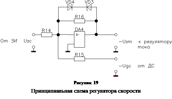 Выразив ЭДС, получим уравнение датчика. Структурная схема датчика тока приведена ниже. Для возможности практической реализации форсирующего звена и защиты системы от помех в сигналах датчиков в канале тока и напряжения датчика ЭДС добавлено инерционное звено с постоянной времени Тμ. Таким образом реальный датчик ЭДС будет инерционным. 7.3 Конструктивный РАСЧЕТРассмотрим реализацию управляющей части контура тока якоря в аналоговой системе автоматического управления электроприводом на базе операционных усилителей. Принципиальная схема регулятора тока и цепи компенсации ЭДС представлена на рис. 16. Регулятор реализован на усилителе DA1, звено компенсации ЭДС - на усилителе DA2. Усилитель DA3 предназначен для суммирования сигналов в датчике ЭДС. Для расчета элементов схемы по известным значениям параметров в относительных единицах используем базисные величины: Iбр = 0,5 мА - базисный ток регулирования принимаем, как рекомендуется в [5]. Uбр = 10 В - базисное напряжение регулирования.