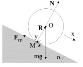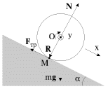 Последнее уравнение получается из условия, что цилиндр скатывается без проскальзывания, то есть скорость точки М цилиндра равна нулю. Уравнение движения центра масс (3.1) запишем для проекций ускорения и сил на ось x вдоль наклонной плоскости, а уравнение моментов (3.22) - для проекций углового ускорения и момента силы трения на ось y , совпадающую с осью цилиндра. Направления осей x и у выбраны согласованно, в том смысле, что положительному линейному ускорению оси цилиндра соответствует положительное же угловое ускорение вращения вокруг этой оси. В итоге получим: