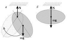 Стержень, опирающийся одним из концов на гладкую горизонтальную плоскость (рис.1.16), падает таким образом, что его центр масс остается на одной и той же вертикали - нет сил, которые сдвинули бы центр масс стержня в горизонтальном направлении. Опыт, который был представлен на рис. 2.2 а, в, свидетельствует о том, что для изменения момента импульса тела существенна не просто сила, а ее момент относительно оси вращения. Тело, подвешенное в точке, не совпадающей с его центром масс (физический маятник), начинает колебаться (рис. 3.2а) - есть момент силы тяжести относительно точки подвеса, возвращающий отклоненный маятник в положение равновесия. Но тот же маятник, подвешенный в центре масс, находится в положении безразличного равновесия (рис. 3.2б).