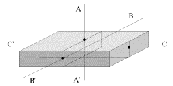 действуют силы И только в том случае, когда ось вращения совпадает с главной центральной осью инерции тела (рис.3.6в), раскрученный и предоставленный сам себе стержень не оказывает на подшипники никакого воздействия. Такие оси называют свободными осями, потому что, если убрать подшипники, они будут сохранять свое направление в пространстве неизменным. Иное дело, будет ли это вращение устойчивым по отношению к малым возмущениям, всегда имеющим место в реальных условиях. Опыты показывают, что вращение вокруг главных центральных осей с наибольшим и наименьшим моментами инерции является устойчивым, а вращение вокруг оси с промежуточным значением момента инерции - неустойчивым. В этом можно убедиться, подбрасывая вверх тело в виде параллелепипеда, раскрученное вокруг одной из трех взаимно перпендикулярных главных центральных осей (рис. 3.7). Ось AA' соответствует наибольшему, ось BB' - среднему, а ось CC' - наименьшему моменту инерции параллелепипеда. Если подбросить такое тело, сообщив ему быстрое вращение вокруг оси AA' или вокруг оси CC', можно убедиться в том, что это вращение является вполне устойчивым. Попытки заставить тело вращаться вокруг оси BB' к успеху не приводят - тело движется сложным образом, кувыркаясь в полете.