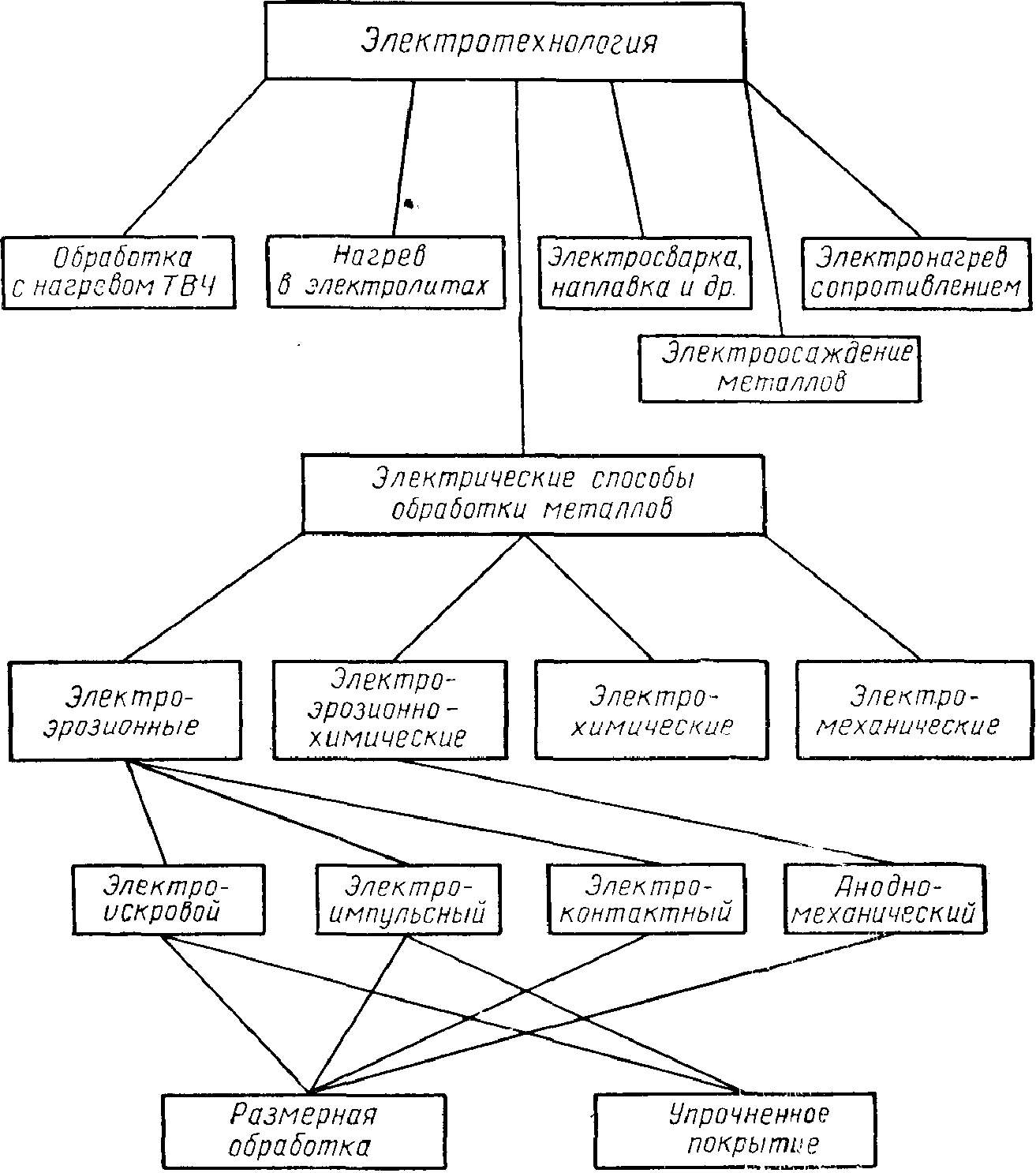 Схема 1. Общая классификация электроэрозионных способов обработки металлов. Как видно из схемы 1, электроискровой и электроимпульсный способы позволяют произвести как съем металла, так и упрочнение; анодно-механический и электроконтактный - только съем металла. В зависимости от того, каким способом производится обработка или упрочнение, можно говорить об электроискровой, электроимпульсной, электроконтактной или анодно-механической размерной обработке или упрочнении. Приведенные определения и классификация позволяют рассматривать электрическую обработку металлов как самостоятельную отрасль электротехнологии. С появлением электрических способов обработки оказалось в принципе возможным осуществление методами электротехнологии всего комплекса операций, необходимых для превращения заготовки в готовую деталь, включая и ее термическую обработку. Электроэрозионные способы не исключают механическую обработку, а дополняют ее, занимая свое определенное место, соответствующее их особенностям, а именно: возможности обработки токопроводящих материалов с любыми физико-механическими свойствами и отображения формы инструмента в изделии. Следовательно, использование электроэрозионных способов обработки будет развиваться с повышением твердости и вязкости обрабатываемых материалов, с усложнением формы детали и обрабатываемых поверхностей (полости сложной конфигурации, отверстия с криволинейной осью, отверстия весьма малого диаметра, тонкие и глубокие щели простой и сложной формы и т. п.), наконец, с улучшением технико-экономических показателей электроэрозионных способов обработки - повышением производительности, чистоты поверхности, точности, стойкости инструмента и снижением энергоемкости процесса. Особо перспективным является использование электрических способов для обработки деталей из твердых сплавов, жаропрочных сталей и специальных трудно обрабатываемых сплавов, получающих все большее применение в связи с повышением давлений, температур и скоростей в машинах и аппаратах. Отдельные элементы разновидностей и частные применения электроэрозионной обработки металлов были известны давно. Например, резка металлов с наложением электрического тока (так называемая, электрофрикционная резка, близкая по схеме и параметрам к электроконтактной обработке) применялась около 70 лет тому назад; поверхностное упрочнение угольным электродом с помощью электрического тока по методу Д. Н. Дульчевского предложено в 1928 г. и др. Однако быстрое развитие способов электроэрозионной обработки металлов и превращение их в самостоятельную отрасль электротехнологии началось вскоре после изобретения в 1943 г. Б. Р. и Н. И. Лазаренко электроискрового способа и В. Н. Гусевым - анодно-механического способа. Эти способы были дополнены в 1948 г. новым применением электроконтактной обработки (заточка по методу инж. М. Е. Перлина), получившим дальнейшее развитие в работах Харьковского электротехнического института, Харьковского подшипникового завода (обработка шаров по методу инж. Б. П. Гофмана), ХТЗ имени Орджоникидзе (обработка траков), научно-исследовательского института Минсудпрома (обработка гребных винтов) и др. Развитие электроискрового и анодно-механического способов шло по линии создания многочисленных опытных конструкций прис