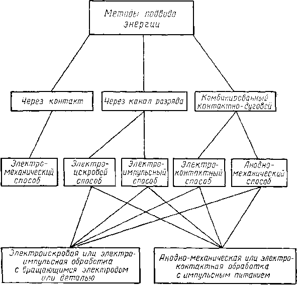 Схема 2. Классификация электроэрозионных способов обработки металлов по методам подвода энергии. На схеме 2 показана классификация способов электроэрозионной обработки металлов по методам подвода энергии и указаны известные в промышленности разновидности, отнесенные к тому или иному способу но принципу сходства наибольшего числа признаков. Наибольшее число разновидностей получается при совмещении источников импульсного тока, необходимых при подводе энергии через канал разряда, с относительным движением электродов, применяемым при комбинированном подводе энергии. К этим разновидностям относятся так называемая низковольтная электроискровая и электроимпульсная обработка тел вращения или обработка вращающимся электродом, анодно-механическая обработка с импульсным питанием и т. п. В зависимости от того, признаки какого из способов превалируют в данной комбинации, можно говорить, например, об электроконтактной обработке с импульсным питанием или об электроимпульсной обработке с вращающимся электродом. То же относится и к другим комбинациям четырех основных способов электроэрозионной обработки. Рассмотрим принципиальные отличия разновидностей размерной электроэрозионной обработки внутри второй и третьей групп. Электроискровой и электроимпульсный способы отличаются, как ниже будет показано подробнее, устройством для генерирования импульсов, параметрами и формой импульса, а также полярностью электродов. Диодно-механический и электроконтактный способы отличаются по роду применяемого тока (в первом случае - постоянный, во втором - переменный, и, реже - постоянный) и по виду рабочей среды (в первом случае - жидкое стекло, во втором - воздух, вода, масло и др.) Следствием этих отличий является, в общем, ухудшение технических характеристик электроконтактного способа по сравнению с анодно-механическим (меньшая производительность при одинаковой чистоте поверхности, больший износ инструмента, ограниченная номенклатура обрабатываемых материалов), при более благоприятных условиях эксплуатации и большей простоте установки в целом. Это обусловливает и различные области их применения. Как следует из изложенного, независимо от способа подвода энергии, известные электроэрозионные способы размерной обработки металлов имеют в основе единую физическую природу - металл удаляется в результате термического действия электрического тока. Отличия заключаются в механизме удаления снятого металла и в технических средствах, обеспечивающих выполнение трех условий размерной электрообработки. Сравнение удельных расходов энергии на съем металла различными способами показывает, что наибольший расход энергии имеет место при электрохимическом растворении (3,85 квт-ч/кг), затем при плавлении (0,35 квт-ч/кг). При механической обработке удельный расход энергии в значительной степени зависит от вида обработки. Так, при шлифовании он составляет, в среднем, 2 квт-ч/кг, строгании, сверлении и фрезеровании 0,20-0,25 квт-ч/кг, точении 0,045 квт-ч/кг. При сопоставлении этих данных следует иметь в виду, что удельный расход энергии для электрохимического растворения и плавления практически не зависит от механических свойств обрабатываемых материалов, в то время, как при механической обработке увеличение, например, твердости обрабатываемого материа