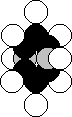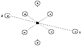 Рис. 1. Схема ядра атома кислорода: светлые – протоны, темные и серые – нейтроны На рис.2 представлена схема атома кислорода, следующая из структуры его ядра (рис.1). Он имеет восемь электронов, наиболее активны те из них (1, 2), что расположены на оси симметрии. Шесть других электронов, расположенных в плоскости перпендикулярной осевой линии (линии симметрии), своим суммарным электрическим полем удаляют электроны 1 и 2 от ядра на большее расстояние, формируя условия для большей их активности при взаимодействии с электронами соседних атомов [1].