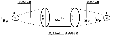 Известно, что соединение водорода с кислородом происходит в большинстве случаев с взрывом, но причина этого до сих пор не известна. Попытаемся найти её. Энергия синтеза молекулы водорода равна 436кДж/моль или 4,53эВ на одну молекулу. Поскольку молекула состоит из двух атомов, то указанная энергия распределяется между ними. Таким образом, энергия одной связи между атомами водорода оказывается равной 2,26эВ (рис.4). При механическом разрыве этой достаточно затратить 2,26эВ. При термическом разрушении этой связи энергии потребуется в два раза больше (2,26×2=4,53эВ).
