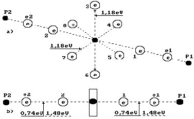 Рис. 2. Схема атома кислорода Наименьшая энергия ионизации электрона атома кислорода равна Ei=13,618эВ, а энергия связи этого электрона с ядром атома, соответствующая первому энергетическому уровню E1=13,752эВ. Назовем этот электрон первым. Расчет энергетических показателей этого электрона, в том числе и энергий связи Eb его с ядром атома, по формулам (1) и (2) даёт следующие результаты (табл.1) [1].