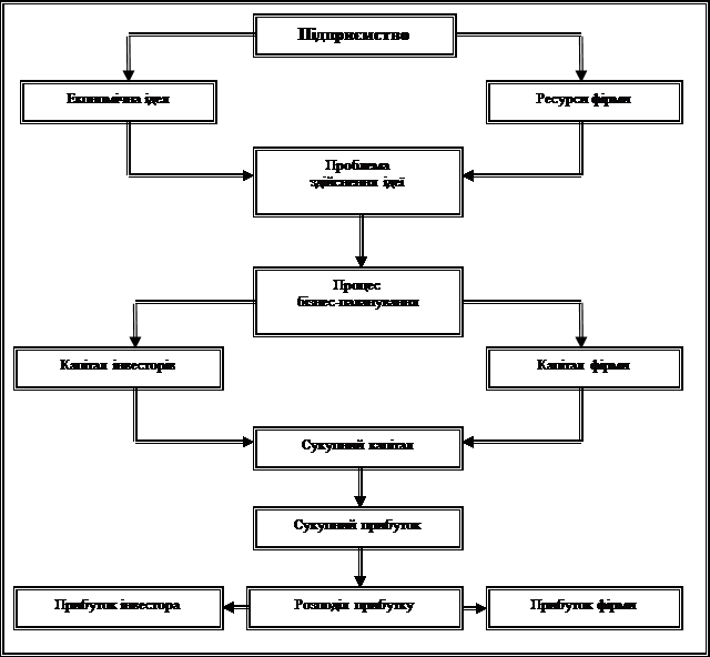 Мал. 2 Схема процесу бізнес-плануванняСтруктурно-логічна схема процесу бізнес планування зображена на Мал.2. Вона пояснює місце процесу бізнес-планування у житті будь-якого інвестиційного проекту. Хоча в цілому бізнес-план вважається інструментом для отримання кредиту, він безумовно виконує функції набагато глибші: Ø виявлення цілей бізнесу Ø сприяння виробленню стратегії та оперативної тактики для досягнення цілей бізнесу Ø створення системи вимірювання результатів діяльності Ø надання інструментів для управління бізнесом Ø виявлення альтернативних напрямків розвитку. Існують різні вимоги до бізнес-плану для вже існуючої компанії та для компанії, що починає створюватися, існування якої залежить від даного проекту. У випадку вже існуючої компанії, бізнес-план повинен містити звіт про минулу роботу та базуватися саме на ній, у той час, як у випадку нової компанії, особлива увага повинна бути відведена самому проекту. Існує велика кількість розробок щодо складання бізнес-плану, проте всі вони частково відтворюють одна одну та можуть відрізнятися послідовністю розділів. Так чи інакше, бізнес-план повинен містити наступні розділи: 1. Стислий опис 2. Бізнес та його стратегія 3. Ринок та маркетингова стратегія 4. Виробництво та експлуатація 5. Управління та процес прийняття рішень 6. Фінанси 7. Фактори ризику 8. Додатки Розділ II. Рекомендований зміст основних розділів бізнес-плану 1.1 Частина перша бізнес-плану Короткий опис проектуНажаль, цей розділ дуже часто недооцінюється розробниками проекту. Хоча насправді, він є одним з найважливіших, бо може викликати (або ні) зацікавленість з боку того, хто його читає, тобто потенційного інвестора або банкіра. Як вже зазначалося, залежно від того, чи базується інвестиційний проект на вже існуючій компанії, чи його планується організувати на базі новоствореного підприємства, акцент повинен бути зроблений відповідно на компанії та її стратегії або на самому проекті. Так чи інакше, наведемо перелік головних питань, які повинні бути окреслені у цьому розділі. Проект Ø Назва проекту; Ø Джерела фінансування; Ø Розміщення проекту; Ø Мета проекту; Ø Обґрунтування проекту. Бізнес Ø Коротка історія бізнесу, що описує період його створення та розвитку; Ø Короткий опис існуючої стадії розвитку бізнесу та середи, в якій він здійснюється; Ø Опис того, як було прийнято рішення про просування бізнес-плану та здійснення інвестиційного проекту Продукція Ø Стислий опис того, що робить продукцію унікальною та тих характерних особливостей, які ставлять її поза конкуренцією у ціновому, якісному або іншому відношенні. Ринок Ø Об’єм ринку, що існує, його прогнозоване зростання; Ø Опис ринку внутрішнього та/чи міжнародного; Ø Канали розподілу; Ø Прогнозоване зростання; Ø Визначення орієнтовної частини ринку. Керівництво та персонал Ø Наскільки укомплектований штат? Ø Який освітній рівень? Ø Який рівень безробіття в цій сфері бізнесу? Ø Короткий опис вже набутого досвіду (треба підкреслити сильні сторони!) Фінансування Ø Опис точних цілей необхідного фінансування; Ø Прогнозування доходів та чистого доходу після сплати податків на три роки; Ø Проектування початку надходження прибутку. Отже, саме цей розділ є має особливе значення. Як правило, дуже важливо перше враження від запропонованого проекту, якщо він, 