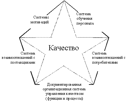 Рис. 2.3. "Звезда качества" В основание звезды качества положим ту или иную систему управления качеством, соответствующую определенной концепции. Будем предполагать, что система эта документирована и охватывает организационную структуру управления предприятием, а также систему управления процессами создания продукции. Последнее очень важно подчеркнуть: мы рассматриваем организацию и как функциональную структуру, и как совокупность процессов.