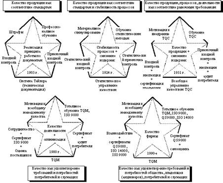 Рис. 2.6. Пять звезд качества 1. Первая звезда соответствует начальным этапам системного подхода, когда появилась первая система – система Тейлора (1905 г). Она устанавливала требования к качеству изделий (деталей) в виде полей допусков или определенных шаблонов, настроенных на верхнюю и нижнюю границы допусков, – проходные и непроходные калибры. Для обеспечения успешного функционирования системы Тейлора были введены первые профессионалы в области качества – инспекторы (в России – технические контролеры). Система мотивации предусматривала штрафы за дефекты и брак, а также увольнение. Система обучения сводилась к профессиональному обучению и обучению работать с измерительным и контрольным оборудованием. Взаимоотношения с поставщиками и потребителями строились на основе требований, установленных в технических условиях (ТУ), выполнение которых проверялось при приемочном контроле (входном и выходном). Все отмеченные выше особенности системы Тейлора делали ее системой управления качеством каждого отдельно взятого изделия. 2. Вторая звезда Система Тейлора дала великолепный механизм управления качеством каждого конкретного изделия (деталь, сборочная единица), однако производство — это процессы. И вскоре стало ясно, что управлять надо процессами. В 1924 г. в БЕЛЛ Телефоун Лэборэтриз (ныне корпорация AT&Т) была создана группа под руководством д-ра Р.Л.Джонса, которая заложила основы статистического управления качеством. Это были разработки контрольных карт, выполненные Вальтером Шухартом, первые понятия и таблицы выборочного контроля качества, разработанные Х.Доджем и Х.Ромигом. Эти работы послужили началом статистических методов управления качеством, которые впоследствии, благодаря д-ру Э. Демингу, получили очень широкое распространение в Японии и оказали весьма существенное влияние на экономическую революцию в этой стране. Системы качества усложнились, так как в них были включены службы, использующие статистические методы. Усложнились задачи в области качества, решаемые конструкторами, технологами и рабочими, потому что они должны были понимать, что такое вариации и изменчивость, а также знать, какими методами можно достигнуть их уменьшения. Появилась специальность – инженер по качеству, который должен анализировать качество и дефекты изделий, строить контрольные карты и т. п. В целом акцент с инспекции и выявления дефектов был перенесен на их предупреждение путем выявления причин дефектов и их устранения на основе изучения процессов и управления ими. Более сложной стала мотивация труда, так как теперь учитывалось, как точно настроен процесс, как анализируются те или иные контрольные карты, карты регулирования и контроля. К профессиональному обучению добавилось обучение статистическим методам анализа, регулирования и контроля. Стали более сложными и отношения поставщик - потребитель. В них большую роль начали играть стандартные таблицы на статистический приемочный контроль. 3. Третья звезда В 50-е годы была выдвинута концепция тотального (всеобщего) управления качеством – TQC. [8]. Ее автором был американский ученый А. Фейгенбаум. Системы TQC развивались в Японии с большим акцентом на применение статистических методов и вовлечение персонала в работу кружков качества. Сами японцы долгое время подчеркивали, что они ис