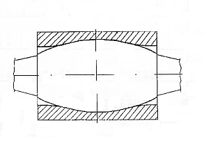 Усовершенствованию конструкций, методам производства и сборки, повышению технологических характеристик составных валков посвящены многие работы отечественных и зарубежных ученых. Большое место занимают работы по обеспечению надежного соединения бандажа с осью. Так, например, в работе [1] предлагается использовать составной прокатный валок, содержащий бандаж с натягом, и наложенный на ось с каналами, выполненными по спирали на контактирующей с бандажом поверхности, и буртом. В работе [2] предлагается к использованию валок с составным бандажом из спеченного карбида вольфрама. В ряде работ последних лет [3,4] все чаще предлагается к использованию наплавленные бандажи из высоколегированных сплавов. Во многих случаях, при упрощении технологии изготовлении валка и повышении износостойкости его поверхности, существенно возрастает стоимость, за счет применения большого числа легирующих элементов. Потому, с целью увеличения срока эксплуатации валков, многие авторы посвящают свои работы усовершенствованию конструкции составных прокатных валков. В работах [5,6] предлагаются составные валки, содержащие несущую профилированную ось и бандаж с профилированной внутренней поверхностью, насаживаемый с натягом с возможностью свободного перемещения его участков меньшего диаметра в нагретом состоянии вдоль несущей оси через участки с большим диаметром по длине. Причем образующие поверхностей бочки оси и бандажа выполнены профилированными в виде плавной кривой по определенным зависимостям (рисунок 1,2). К недостаткам таких валков можно отнести сложность их изготовления, невозможность проконтролировать требуемую кривизну профиля посадочных поверхностей, а в случае [6] еще и ограничены сроки эксплуатации валка, вызванные малым числом возможных переточек бандажа, вследствие возникновения растягивающих напряжений в средней части от разогрева и теплового расширения несущей оси в процессе работы прокатной клети (рисунок 2). Но главным недостатком все же можно считать сложность кривых, описывающих профили сопрягаемых поверхностей, которая затрудняет процесс токарной обработки, а точность, требуемая при