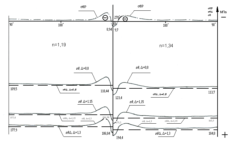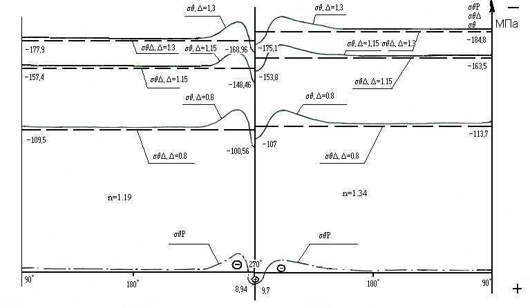 Рисунок 6 Рисунок 7 Рисунок 8 Анализ полученных данных позволил выявить следующие закономерности: наименьшие значения rp принимает по линии действия сосредоточенной силы Р вместе ее непосредственного приложения =270. При некоторых значениях угла 295 для n=1,34 и 188 для n=1,19 значения rp меняют знак. Напряжения сжатия переходят в напряжения растяжения, стремящиеся нарушить монолитность соединения. Следовательно, эпюры rp могут иметь определенное физическое толкование: точки контакта, в которых происходит смена знаков напряжений, определяют области зоны раскрытия стыка при отсутствии контактного давления от натяга за счет упругой деформации бандажа. Чем тоньше бандаж, тем более максимально увеличение rp при =270 и тем больше градиент напряжений в области =260280. Напряжения растяжения, тем больше, чем толще бандаж, но их градиент незначителен, то есть чем тоньше бандаж, тем больше усилия сжатия на оси. На эпюрах тангенциальных напряжений в зоне действия силы Р видно, что р являются растягивающими, причем их максимальная величина практически не зависит от толщины бандажа. Градиент напряжений увеличивается с уменьшением толщины бандажа, а ширина зоны уменьшается. На большей части контактной поверхности оси и бандажа напряжения являются сжимающими с меньшим градиентом для n=1,34. Эпюры касательных напряжений r на рисунке 9 меняют знак в точках при 215 и на большей части контактных поверхностей являются растягивающими, но малыми для обоих случаев, а, следовательно, не слишком значительными. В таблице 3 представлены значения r и для различных значений и n. Таблица 3 – Величина контактного давления и тангенциального напряжения от натяга.