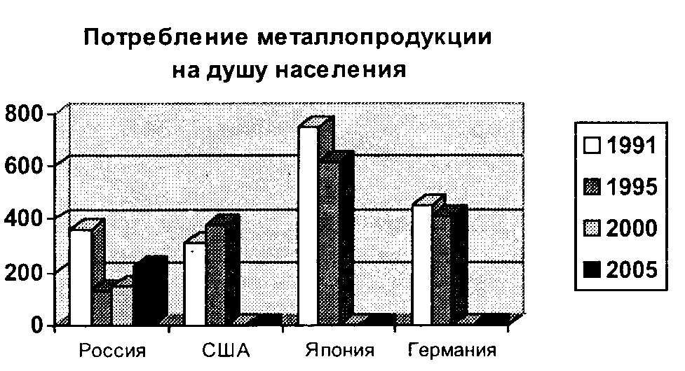 приобрели по импорту. То есть. потребность в стране есть, однако уровень качества отечественного машиностроения низок, и его потребители неплатежеспособны. Значительный импорт следствие недостаточного качества и связанного кредита. Именно этим, в частности, можно объяснить такие большие объе импортной металлопродукции. А импорт металлопродукции в виде готовых машин сокращает внутреннее металлопотребление. Если в 1995 г. приобрели по импорту почти на 15 млрд. долларов машин и оборудования, тем сам только через машины и оборудование завезли в страну в пересчете на прокат около 2 млн. т металла. На графике показаны удельное потребление и металлопотребление и валовая продукция. Это эмпирическая кривая металлопотребления на душу населения. Сегодня на душу населения приходится 112120 кг, в 1996 г. было 129 кг. Чтобы повысить металлопотребление, валовой внутренний продукт на душу населения должен превышать 15 тыс. долларов. В РФ он сегодня составляет 3 тыс. долларов и неизвестно, когда он повысится хотя бы до 10 тыс. долларов. Исходя из макропоказателей, видим ограниченность нашего внутреннего рынка. Здесь как раз видно металлопотребление на душу населения. До 2005 г. в соответствии с проектируеми макропоказателями металлопотребление по России должно составить около 220230 кг на душу населения, в то время как Япония, США, Германия уже сегодня имеют 350 кг и более. Но большее металлопотребление у них связано, в частности, с тем, что эти государства вывозят машины и оборудование. Потенциальный рынок черных металлов безусловно есть, он связан с тем, что все основные фонды устарели. К началу века Россия выходит с трубопроводами, которых у нас около 2 млн. км, и на 5070% они изношены и это грозит авариями и катастрофами. Износ транспорта превышает 52%, особенно автомобильного и морского, 63% судов нежелательны для захода в иностранные порты, поскольку они не отвечают современным требованиям. Одна треть автомобильных мостов и тоннелей пришли в полную негодность, подобная картина с железнодорожными мостами и тоннелями. В два с лишним раза меньше производство электроэнергии на душу населения. Потенциальным потребителем металла является автостроение, потребление автомобилей на душу населения более чем в 2 раза ниже чем в развитых странах. Казалось бы, есть перспектива роста металлопотребления, но все зависит от макропоказателей развития, которые в себя вбирают балансовую увязку возможностей производства и потребления.