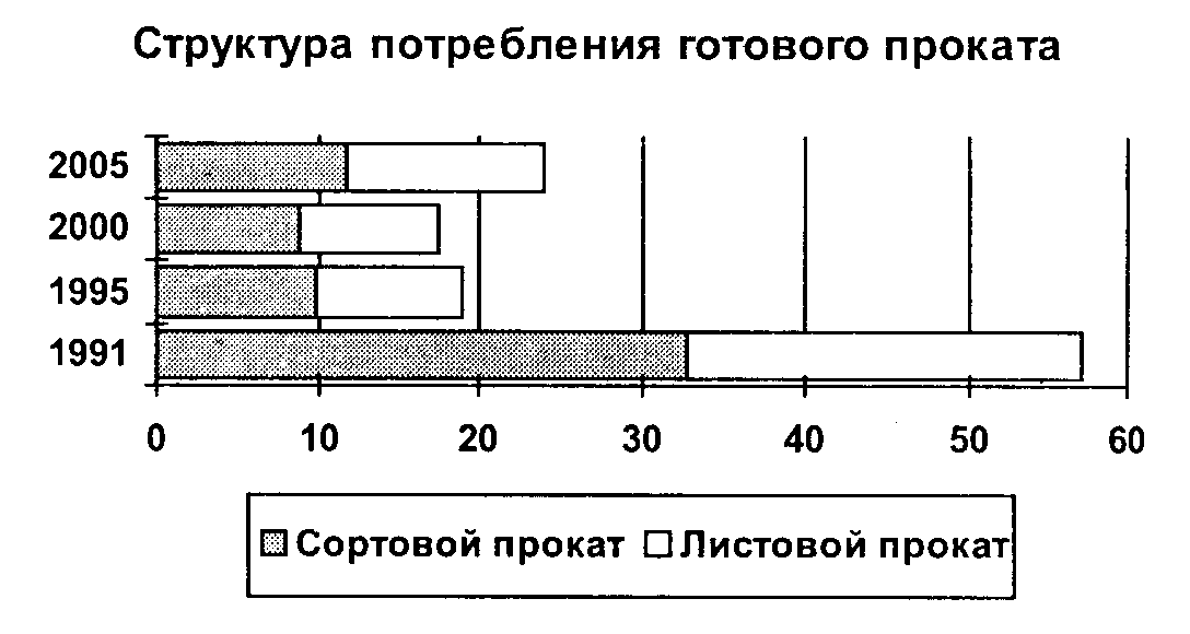 Разработанные Минэкономики макропоказатели развития народного хозяйства не позволяют прогнозировать значительный рост металлопотребления. Инвестиции почти напрямую коррелируют с металлопотреблением. Ожидается, что инвестиции к 2005 г. вырастут против 1997 г. почти в 1.5 раза, на 30% должен вырасти объем прошленной продукции, это говорит о том, что у нас повысится и металлопотребление. Можно сказать, что 1997 г. будет нашей низшей точкой падения, прогнозируется рост производства металлоемких видов продукции. По автомобилям даже превысим уровень 1991 г., но по тракторам, станкам, вагонам приблизимся к уровню 1994-1995 гг. Учитывая ограничения, которые получили на макроуровне, можем прогнозировать потребление металлопродукции в 2000 г. примерно на 1520% больше, чем в 1996 г., а в 2005 г. оно увеличится примерно в 1.52 раза. К тому же следует помнить и понимать, что производство можно удержать только развитием внутреннего потребления. Пик экспорта, наверно, уже прошел, начались антидемпинговые процессы, которые не позволят расширить выход на мировой рынок. Это значит, что укрепление производства возможно только за счет внутреннего рынка. А внутренний рынок это прежде всего помощь машиностроителям и строителям в том, чтобы их продукция была соответствующего качества, это помощь им кредитами отечественных коммерческих банков с тем, чтобы они могли начать производить необходимую продукцию. Очень большим тормозом являются высокие цены внутри страны, они на 1050% выше мировых и экспортных цен. В значительной мере такое перераспределение связано с повышающимися до сих пор тарифами на продукцию и услуги отраслей монополистов. Если эта тенденция будет продолжаться, то правительству срочно потребуется принять заградительные меры против проникновения импортного металла, поскольку здесь уже отрасль сама справиться не сможет.